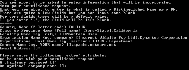 NOTE: Please do not enter an email address, challenge password or an optional company name when generating the CSR